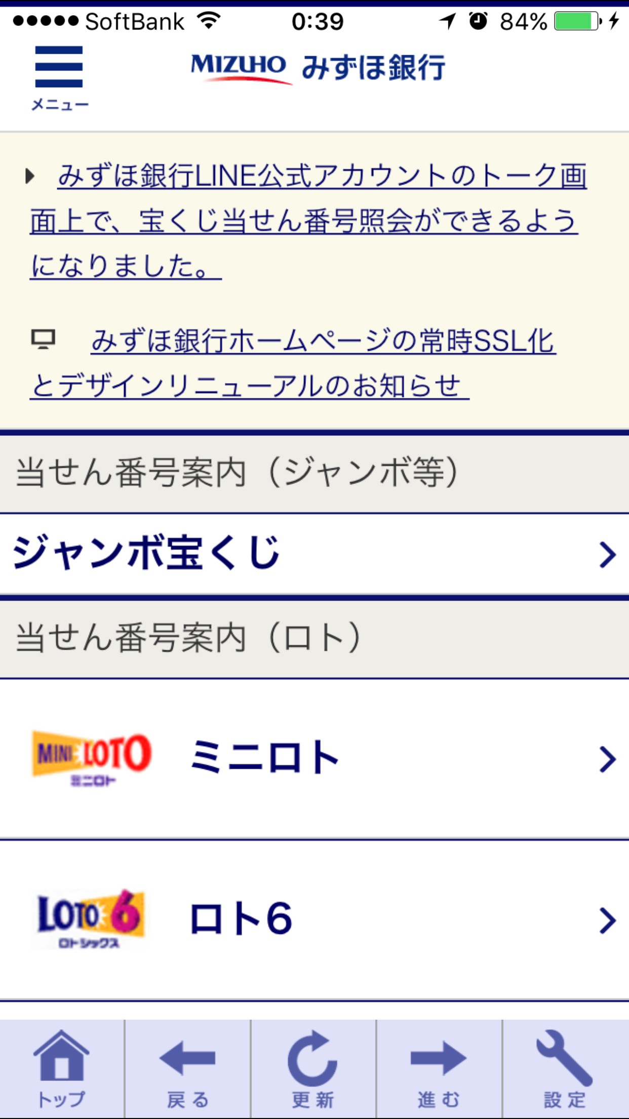 「ジャンボ宝くじ」、「ロト」、「ナンバーズ」、「ビンゴ5」の当選番号が確認できます。