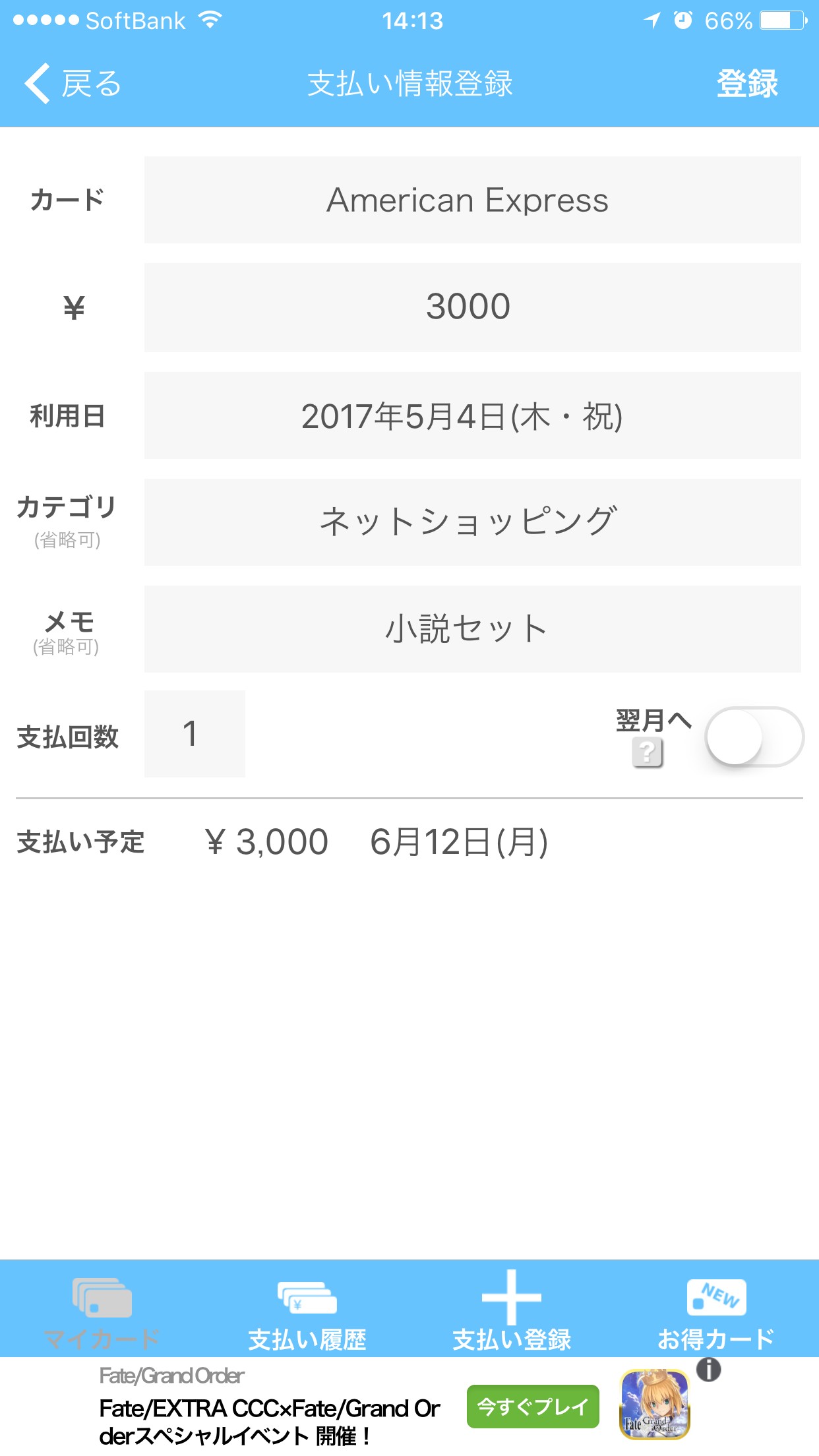 (リストに該当のカードがないときは「その他」を選択し新規に登録することができます)