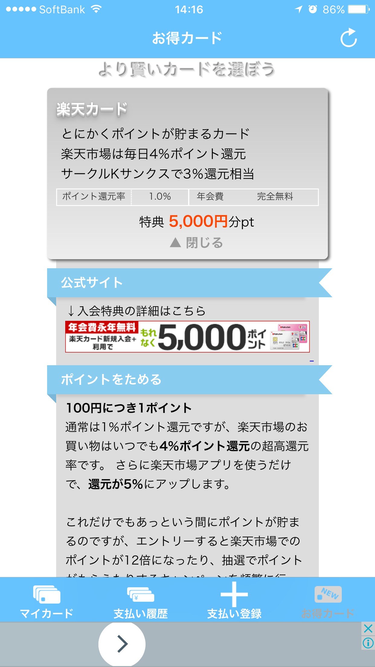 カードのおすすめ概要やポイント還元率、年会費、特典ポイントなど気になる情報が表示されています。