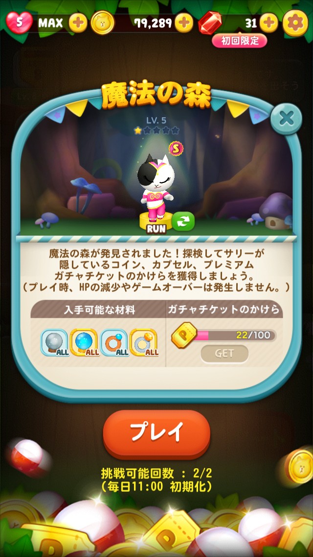 集めるとプレミアムガチャを回すことのできる『ガチャチケットのかけら』が落ちていますので、プレイした日には是非忘れずにやってきたいステージです。