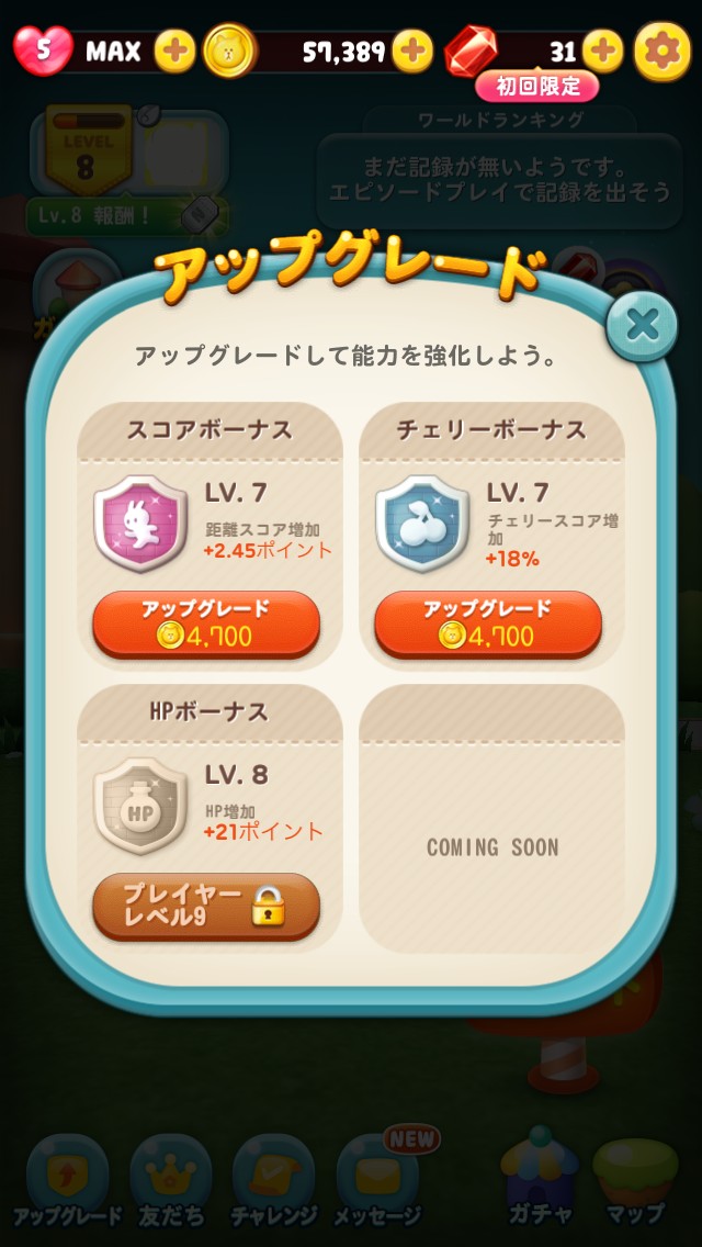 アップグレードは、『スコアボーナス』『チェリーボーナス』『体力ボーナス』と3種類することができ、アップグレードは全てのキャラクターに適用されます。