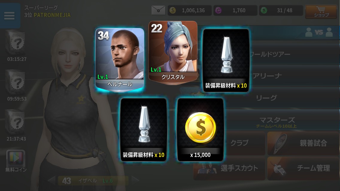 毎日のログインボーナスでアイテムがもらえるゲームがよくあると思いますが、【アルティメットテニス】は22時間、10時間、4時間経過する毎にもらえるアイテムボックスが3ボックスがあります。1試合しなくてはもらえないアイテムなどではなく、タップするだけでもらえるアイテムボックスなので、もらえる状態になっていたら、是非もらっておきましょう。必要時間によってアイテムのレア度とアイテム数が違います。
