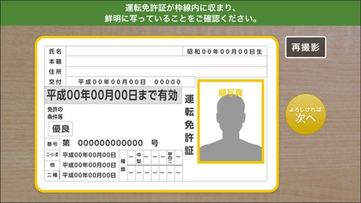 提出する本人確認書類(運転免許証、パスポート、マイナンバーカード)を選択し、撮影します。