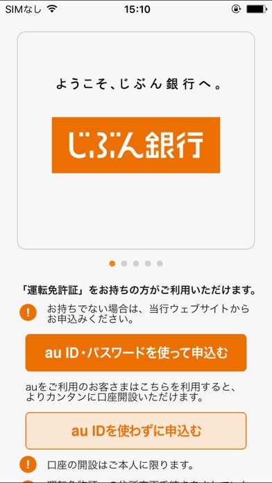 まずアプリを起動すると、申し込み画面が表示されます。au IDとパスワードを持っている方は、au IDで簡単に申し込みできます。au IDを持っていない方、使わない方は同意画面に同意後、運転免許証の両面を撮影します。