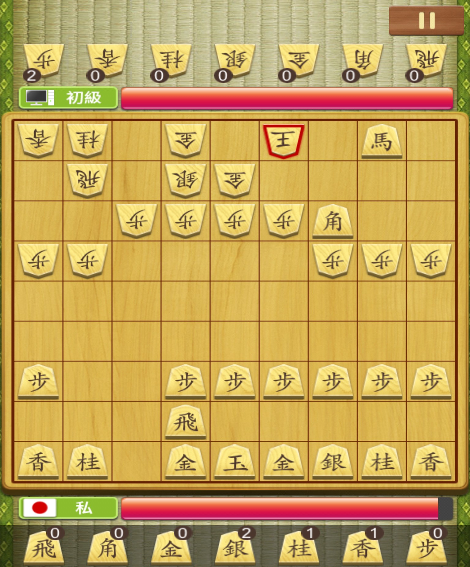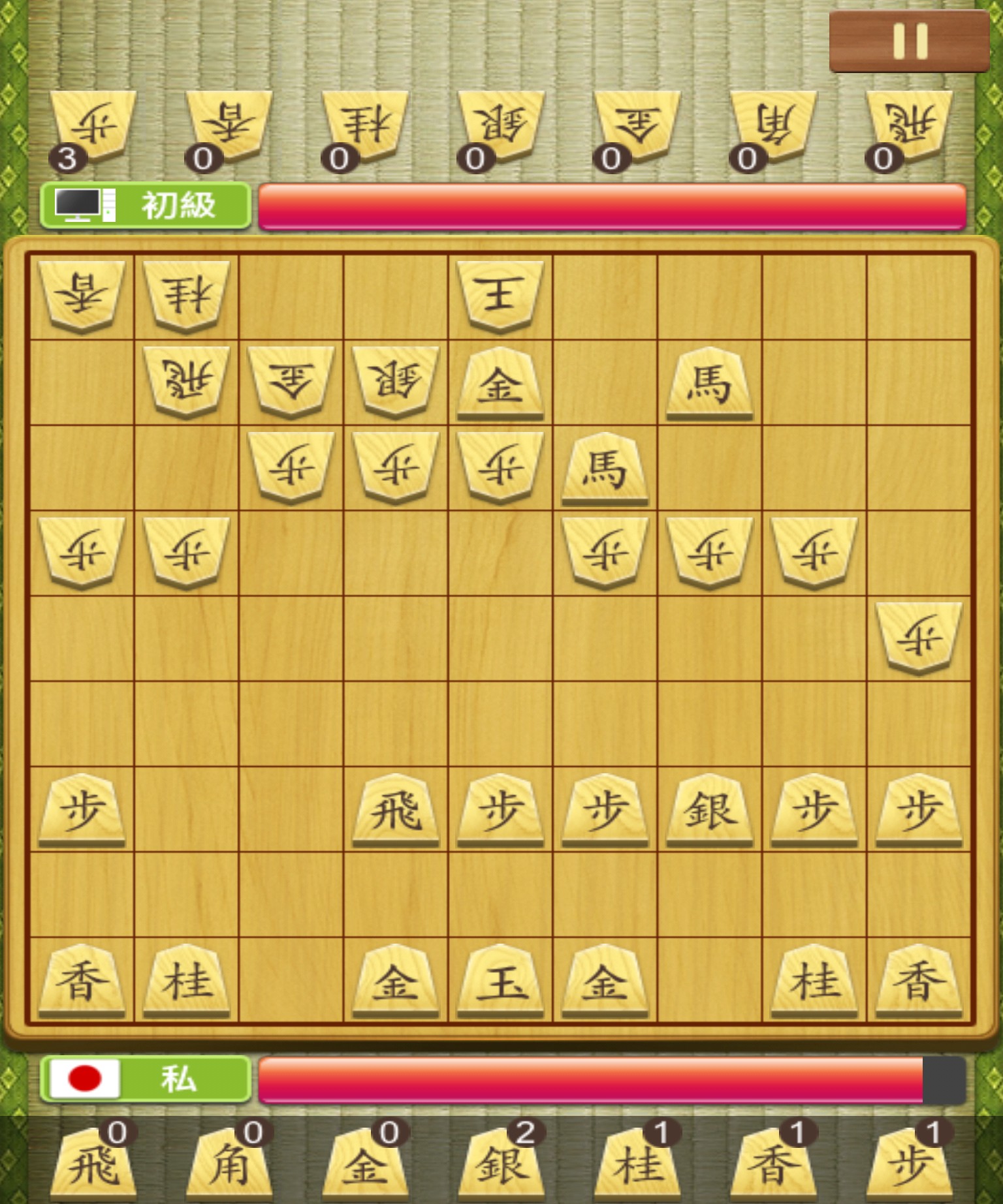 攻めてはきますがそこは「初級」です。駒の連携(自分の駒が取られないように別の駒の進行方向に駒を置いて攻めたり守ったりすること)も特になく攻めてきた駒はただただ取られていきます。