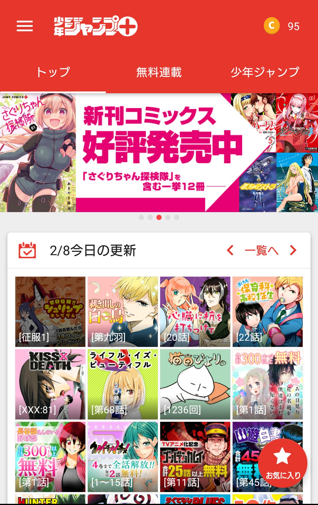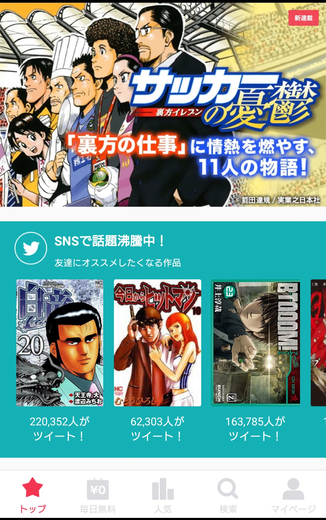 少年ジャンプに近い品揃えの連載が曜日ごとに毎日更新されるので、日々新しいストーリーと出会えるのがなによりの魅力になっています。