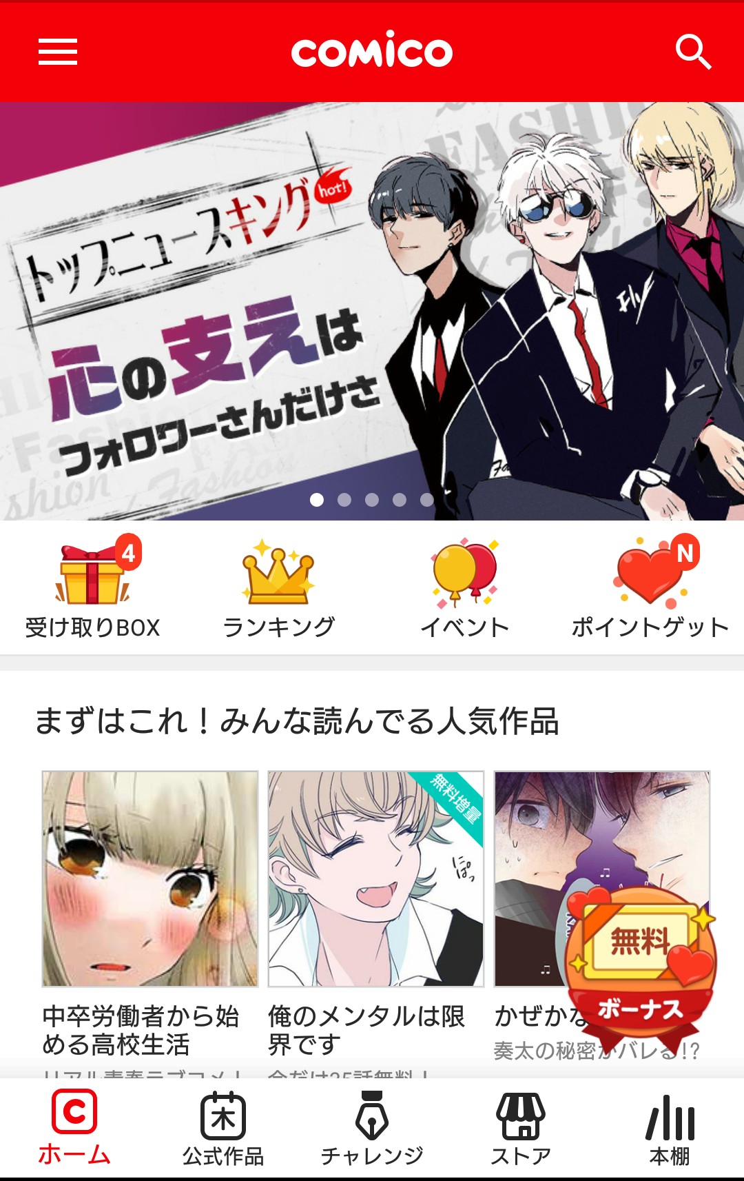 「comico」では、人気作品をピックアップしたホーム画面をトップに、曜日ごとの連載をまとめた【公式作品】、一般公募から成り立つ【チャレンジ】コーナーなど、カテゴリーごとに作品がまとめられています。