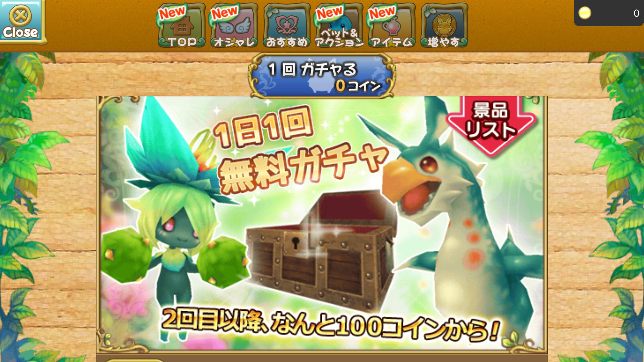 1日1回無料ガチャ(2回目以降は100コイン)とアイテムを獲得できるアイテムガチャがあります。