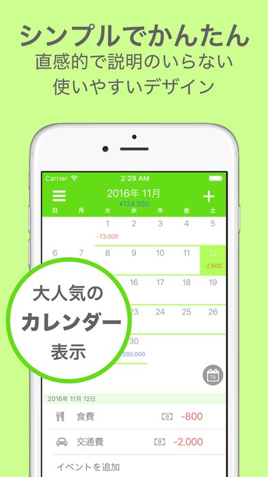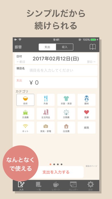 「Moneybook」は、大変シンプルな家計簿です。家計簿を付けたい日付をカレンダーから選択したら、必要項目を入力するだけで簡単に家計管理をすることができます。