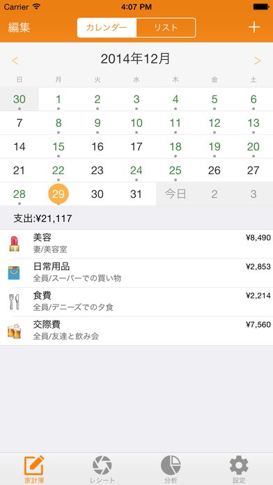「毎日家計簿」も、シンプルさが人気の家計簿アプリです。カレンダー表示の画面で日にちを選択したら、右上の+マークをタッチすれば編集画面に変わります。編集画面に変わったら、必要な項目を入力するだけで日々の記録が完了します。