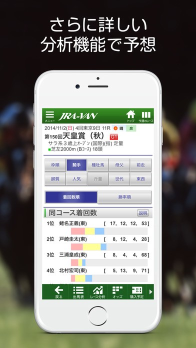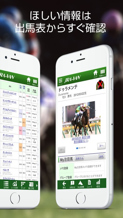 あらゆる方面からレースを切りとり、馬や騎手を分析できる能力を持った「JRA-VAN競馬情報」は、競馬ファンに最高レベルのサポートを約束します。ビギナーも本アプリを導入すれば、競馬の見方が変わってくるかもしれませんよ。