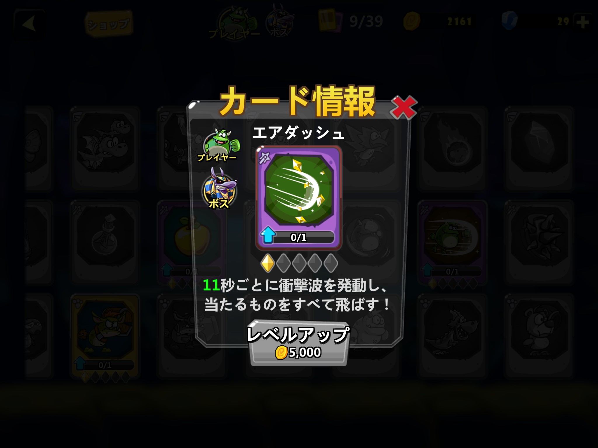「カード」は同じカードを手に入れるとレベルアップでき、レベルアップすることで効果が長持ちしたり、強くなったりします