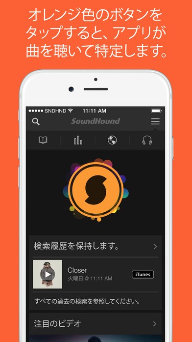 アプリ「SoundHound」は画面内に表示されたオレンジ色のボタンをタップするだけで、簡単に気になる音楽を検索・特定してくれます。疑問を感じたら即検索できる手軽さのおかげで、曲名のわからないもやもやとは無縁でいられますね。