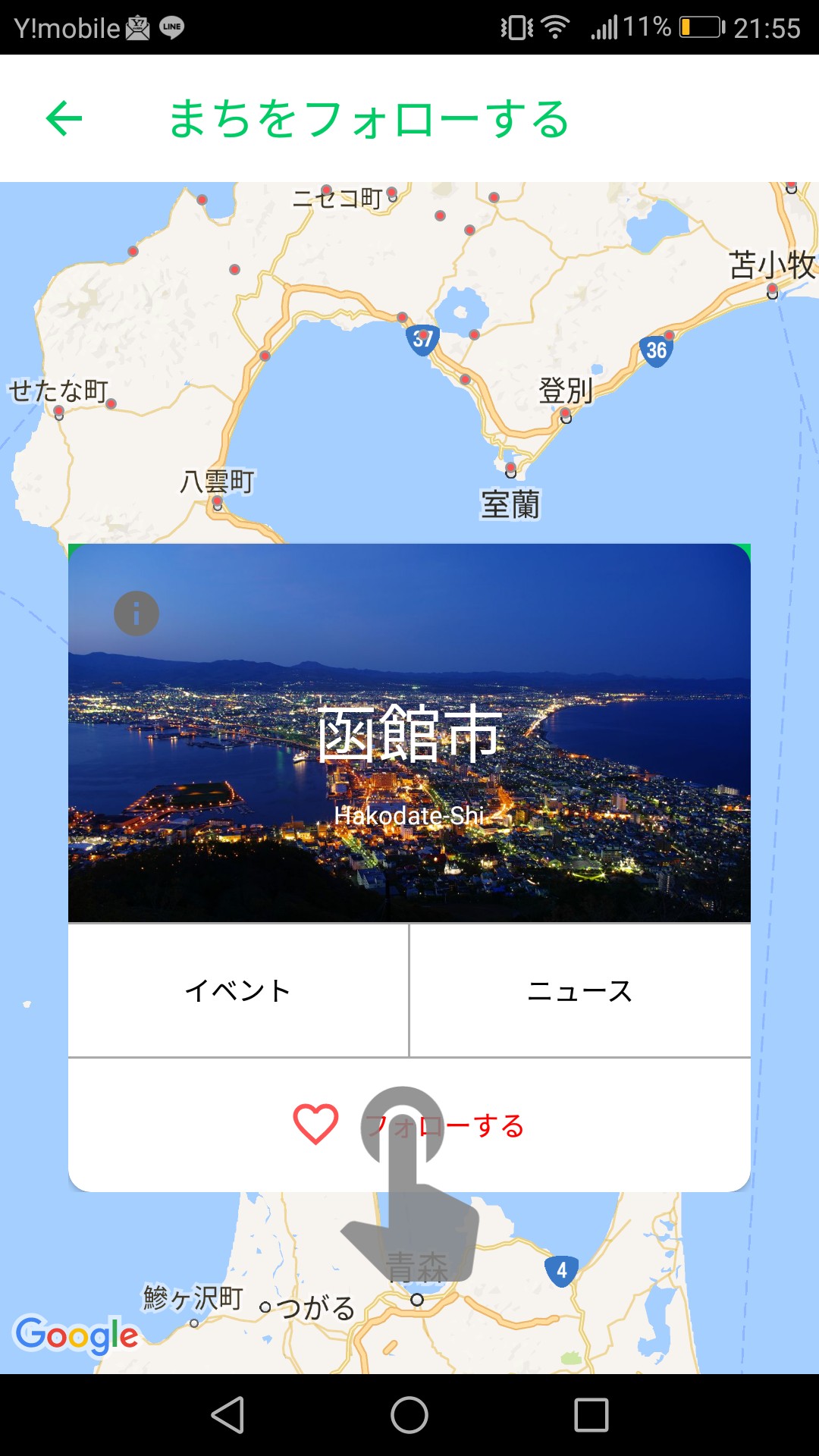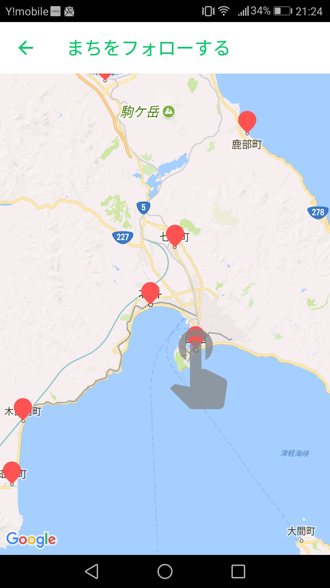「あなたのまち」を登録するには、地図で登録したい地域を表示し、赤いピンマークをタップすることで、まちをフォローできます。