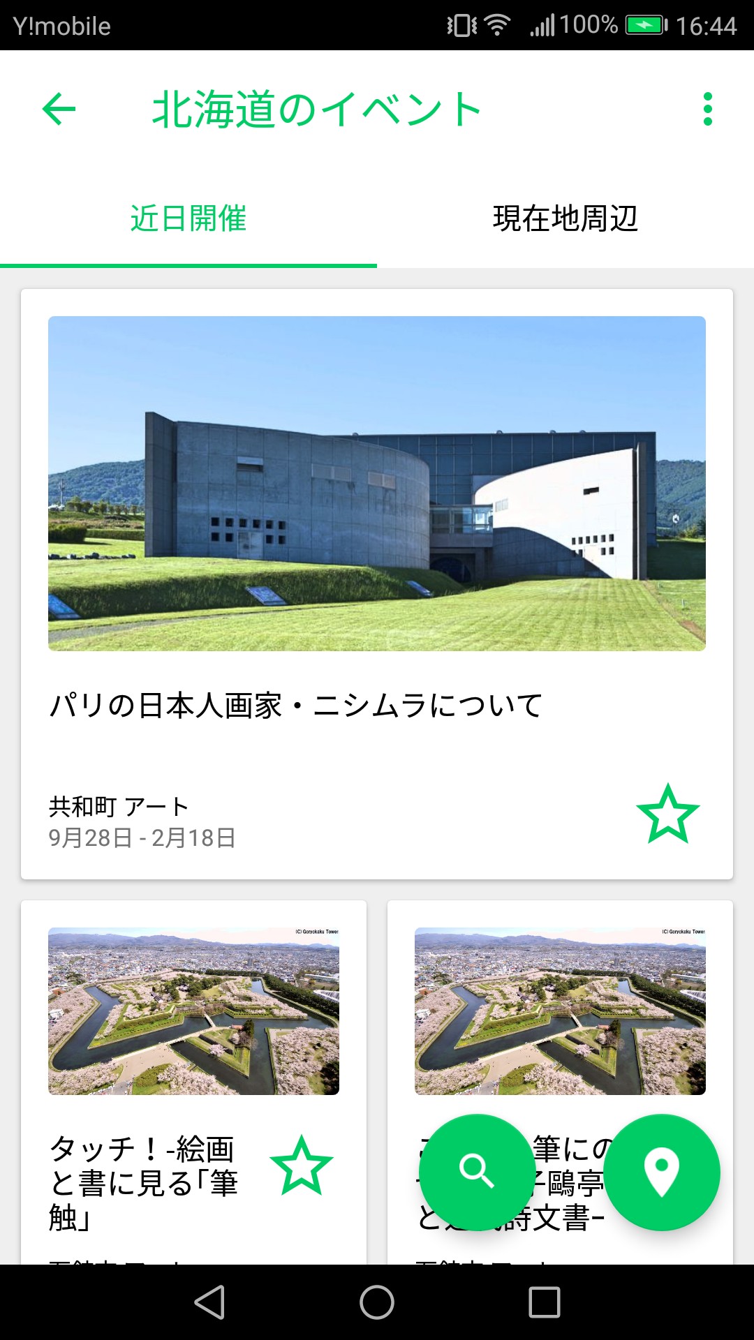 北海道全域のイベント情報画面では「近日開催」「現在地周辺」のイベントを参照できます。