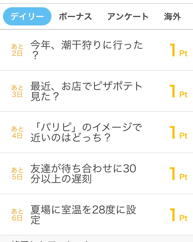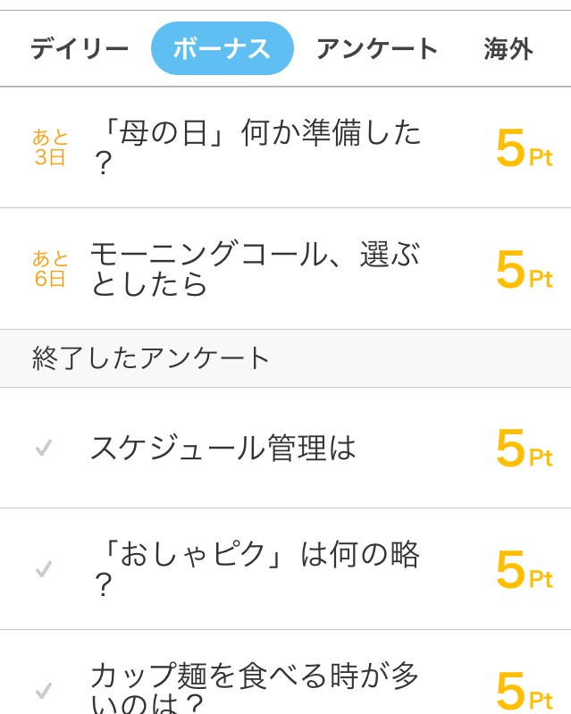 次にボーナスアンケートでは、デイリーアンケートよりも高いポイントを貰えるアンケートが多いです。