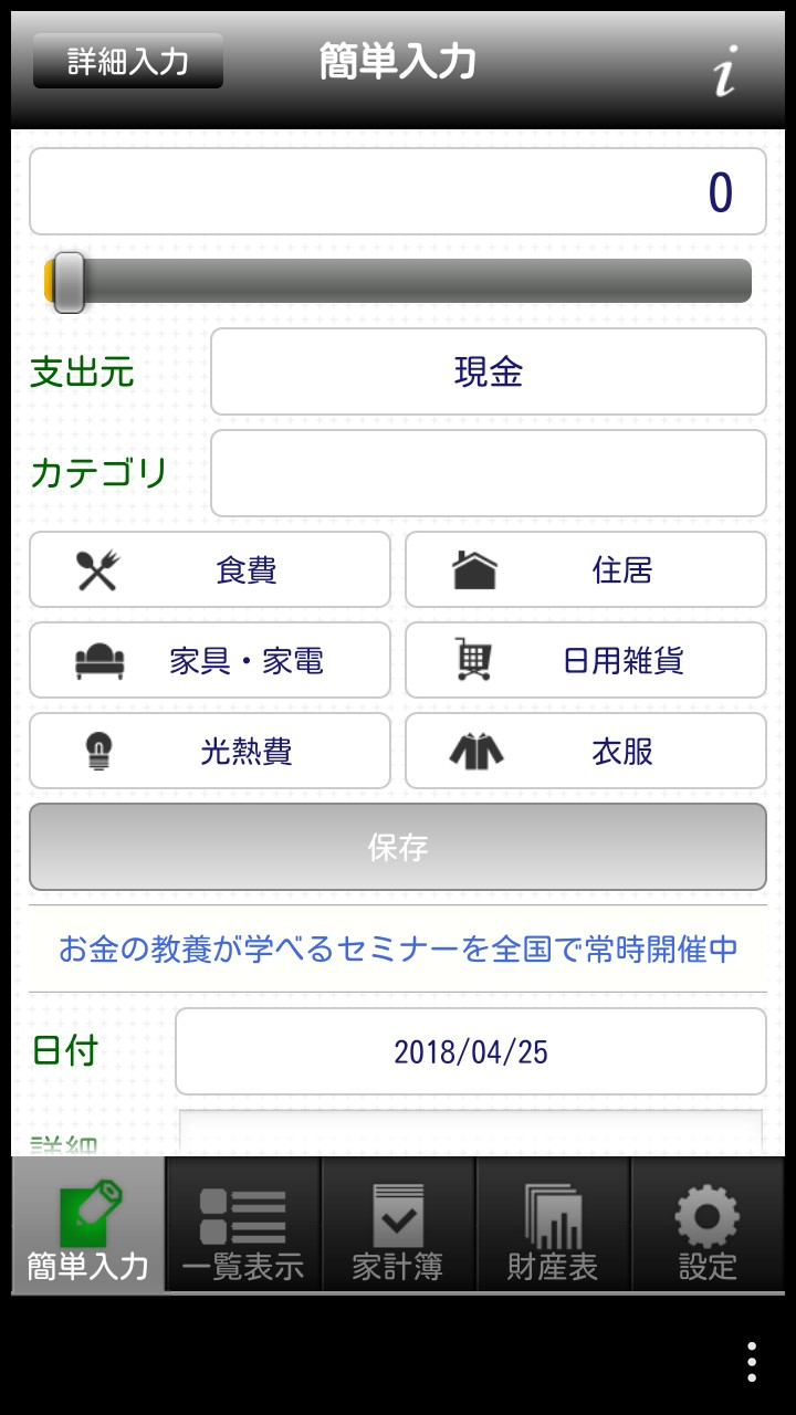 支出金額の入力とカテゴリ、日付を選択して家計簿をつけます。