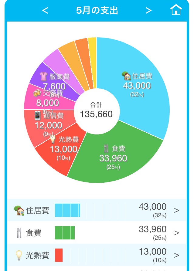 計上した収入と支出の割合を分かりやすい円グラフ表示で確認することができます。カテゴリ毎に色分けされた内訳は見やすく支出の見直しに便利です。円グラフ中央に集計対象期間内の支出の合計が表示されて、支出カテゴリ毎にも金額が表示されます。金額だけでなく%での表示もありますので、自分が多く出費をしているカテゴリが何なのか確認しやすいです。