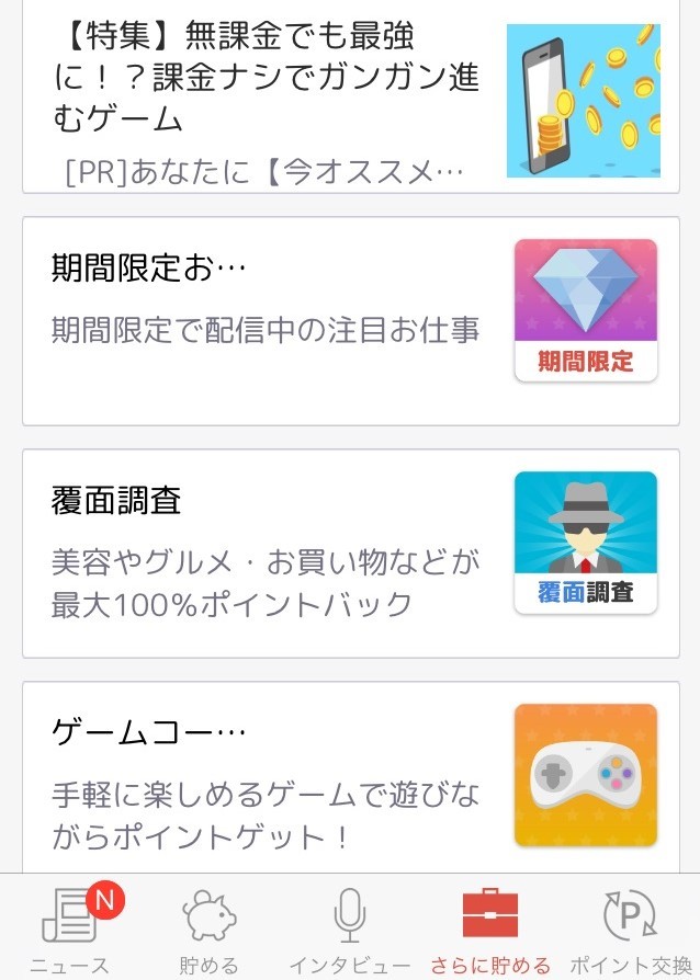アンケートだけでは物足りない方は、アプリで配信されているゲームの体験や動画の視聴でもポイントを貯めることができます。
