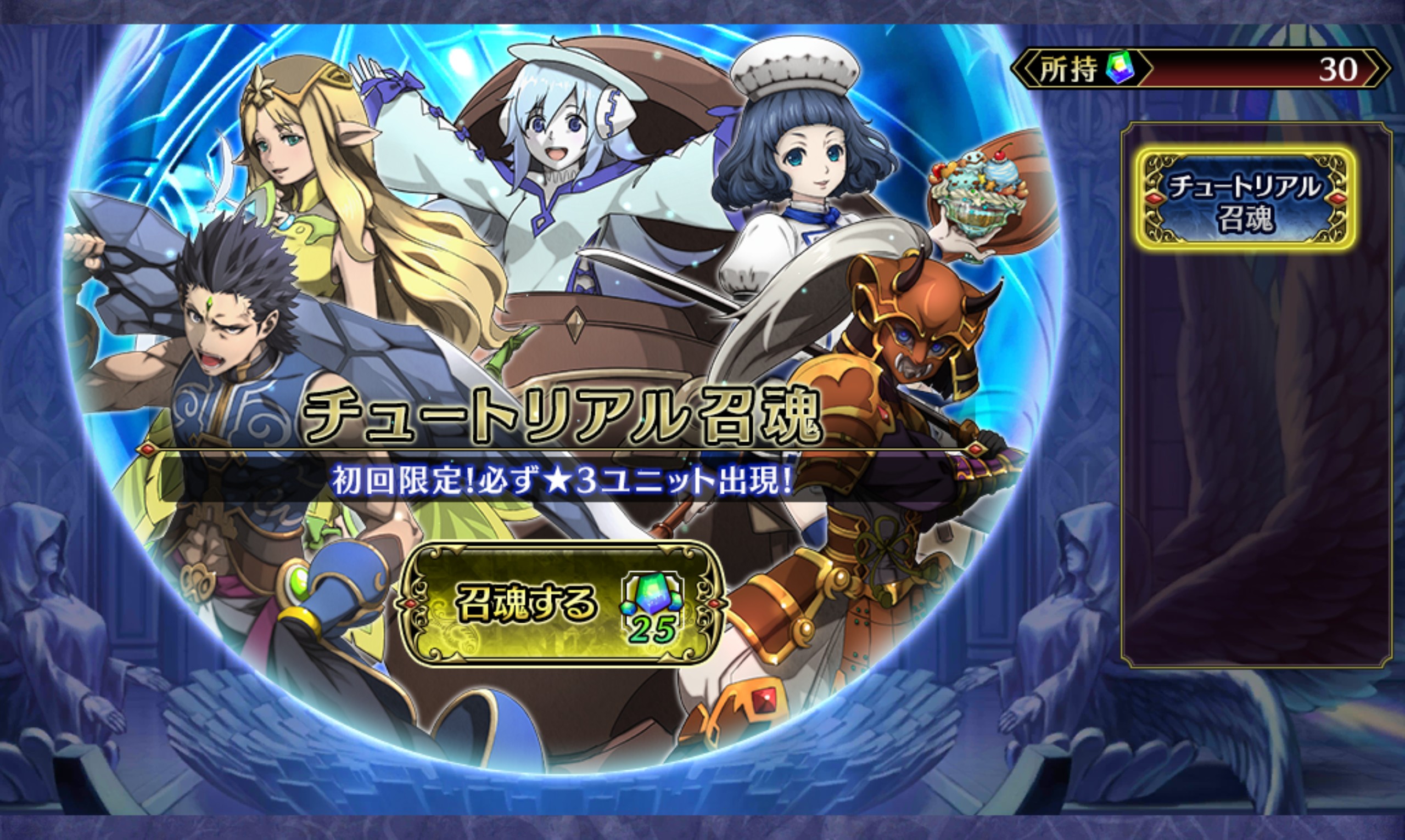 クエストから無事帰還すると"チュートリアル召魂"と呼ばれるガチャを引くことができ、★3のキャラクターを確定で貰う事ができる。