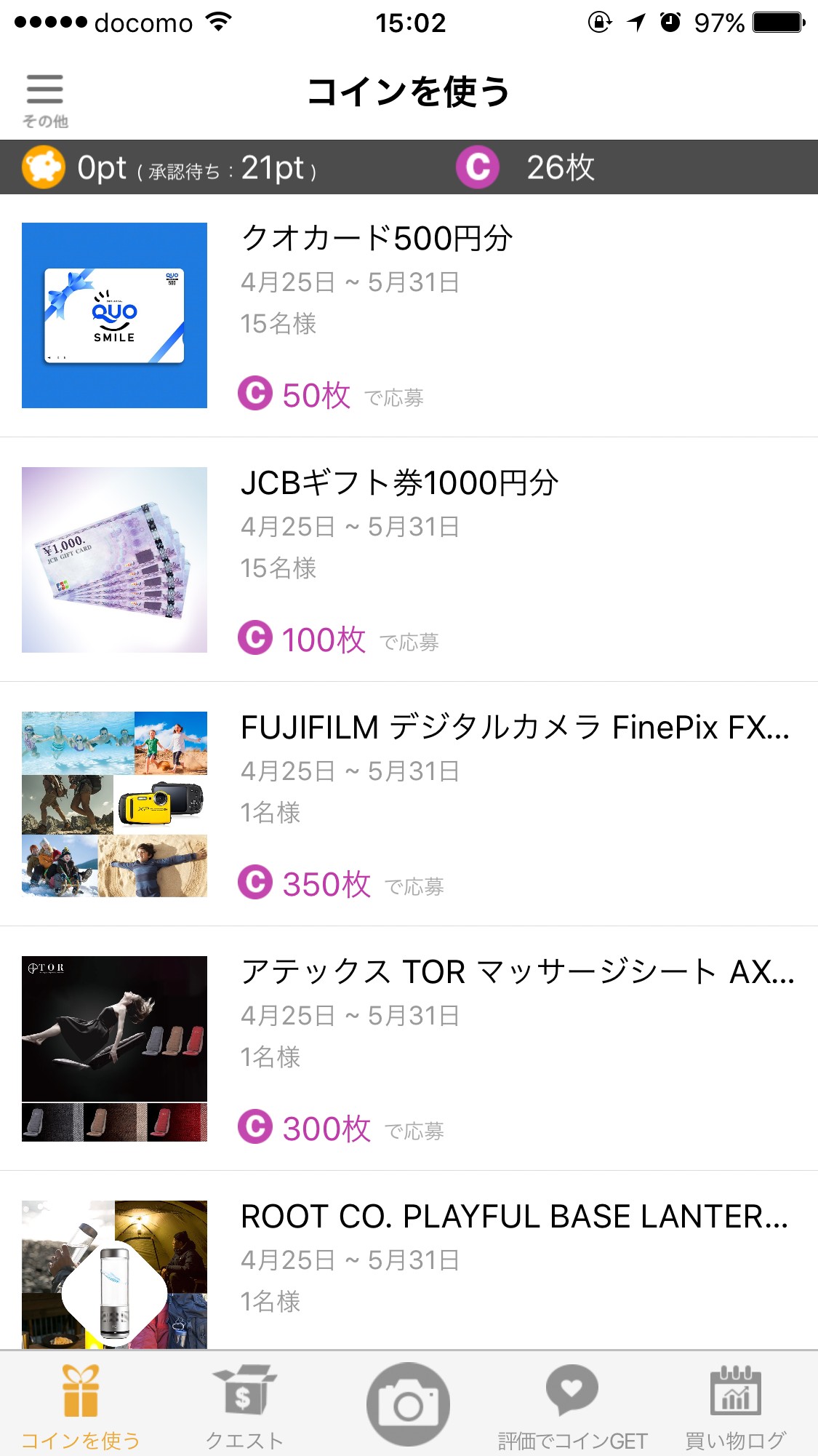 ちなみに、買った商品に点数やコメントを付けたり、写真を載せたりして評価をするとコインをゲットできます。