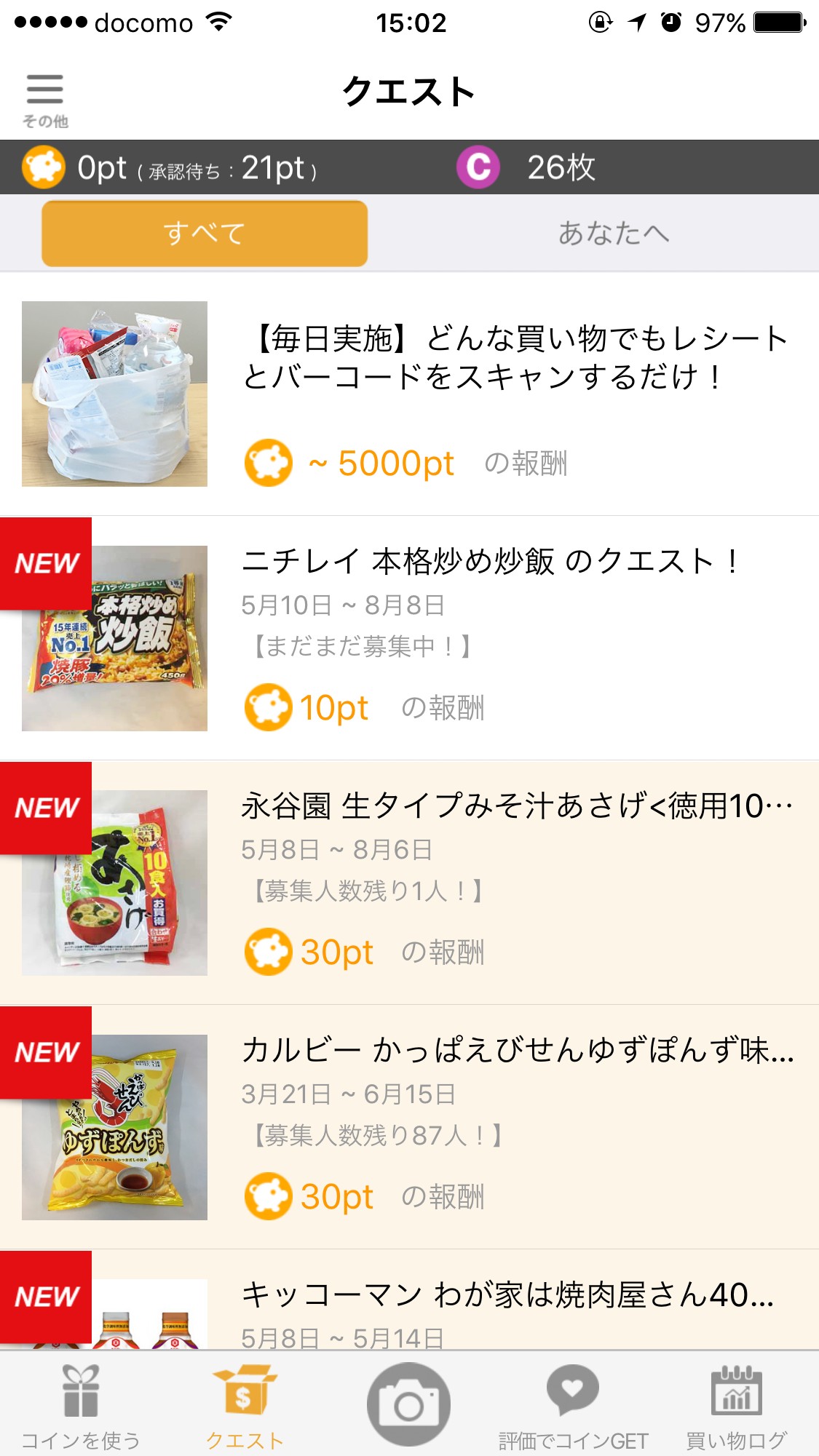 こちらは先ほど紹介したようにレシートとバーコードを登録してゲットする方法と、クエストをクリアしてゲットする方法があります。