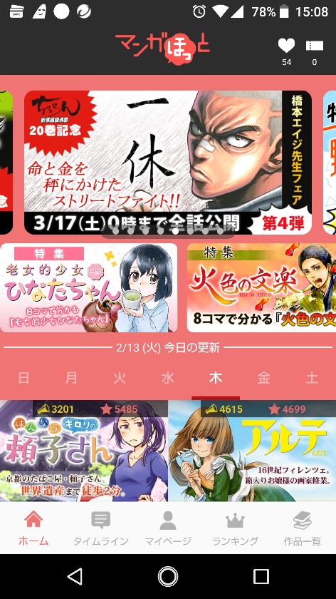マンガほっとは「ほっとするマンガ」「ホットなマンガ」が読めることで、このアプリ名となっているそうで、その名のとおりの作品が公開されています。