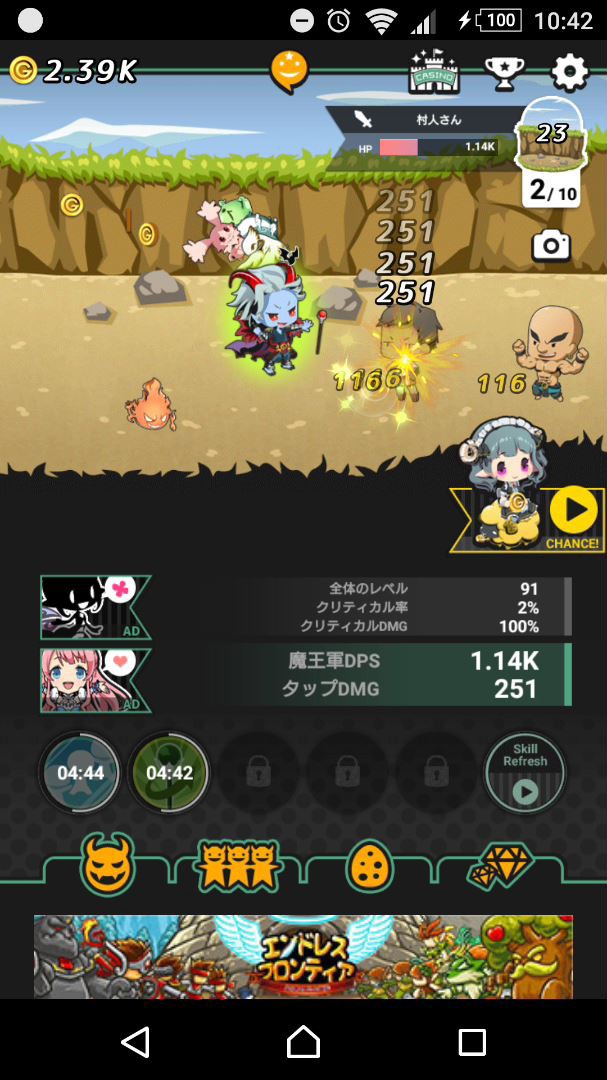 アクティブスキルは「タップした際のダメージアップ」や「魔王さまが分身して2倍のダメージを与える」、「仲間のDPSアップ」などのスキルがあり、取得したアクティブスキルはガルを使用してレベルを上げることができるようになります。