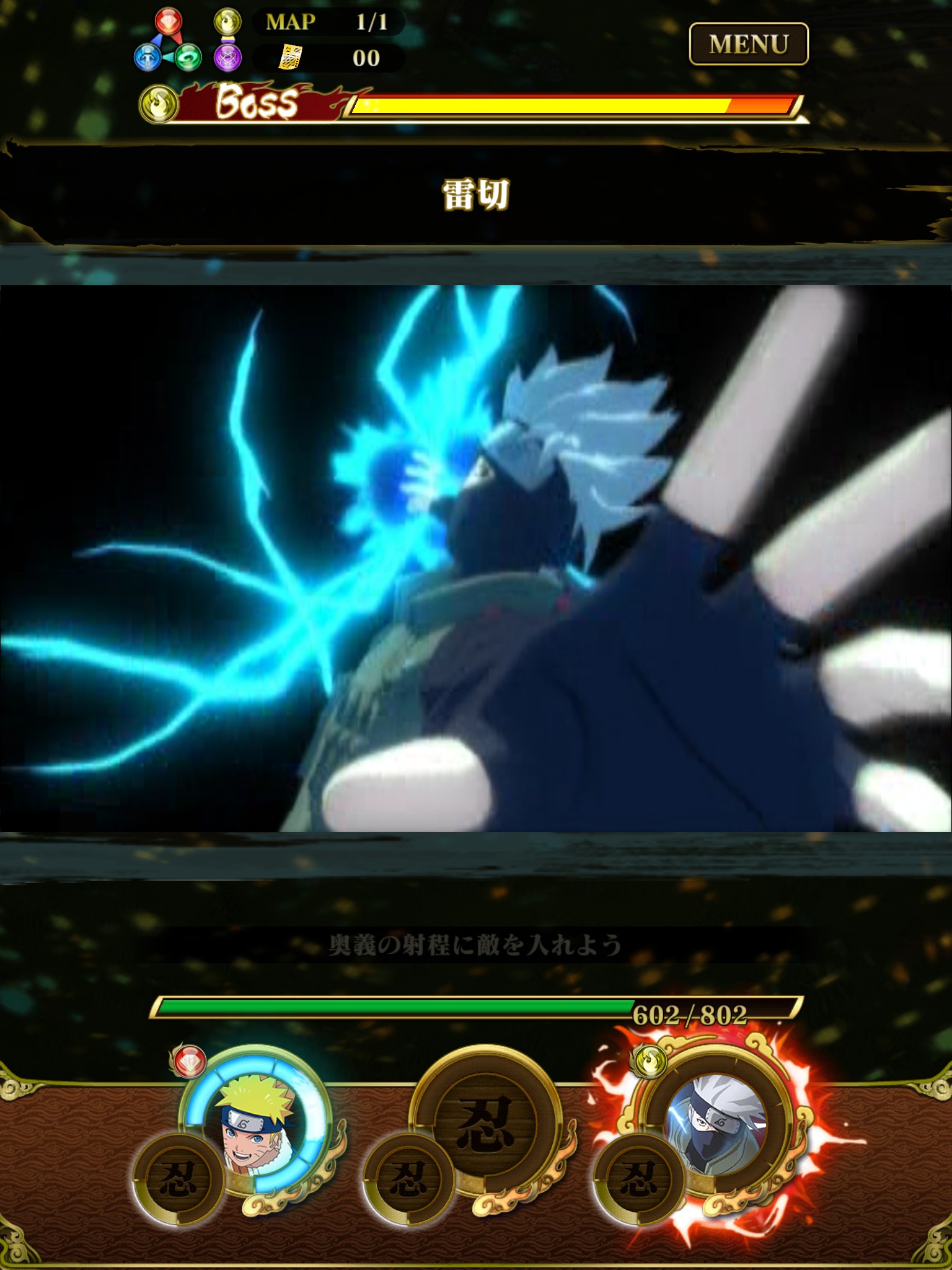 奥義に関してはアニメーションのカットインが入るんです!その後ド派手な演出が広げられます。最初にカカシの雷切を使うことになるのですが、これがまぁかっこいいことかっこいいこと。
