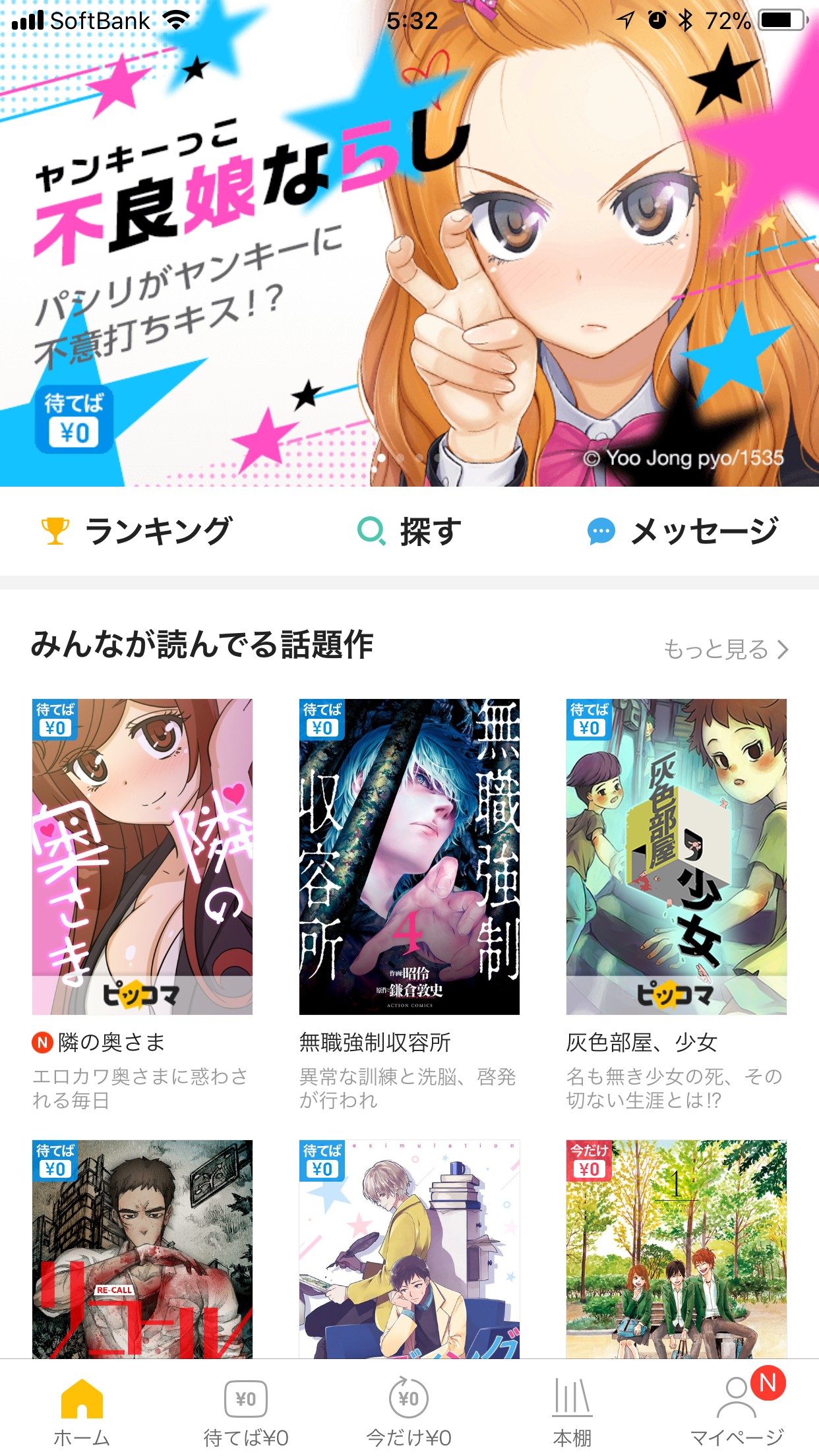 作品は全話無料、期間限定の「今だけ無料」、一定時間待てば無料となる「待てば\0」、有料の4パターンがあります。