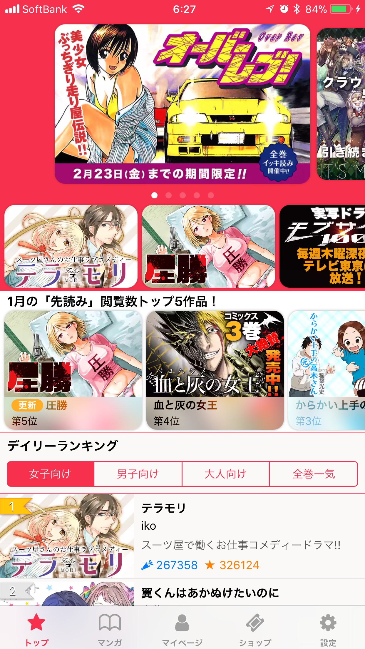 1日2回(9時、21時)に回復するライフを使って漫画を読みます。