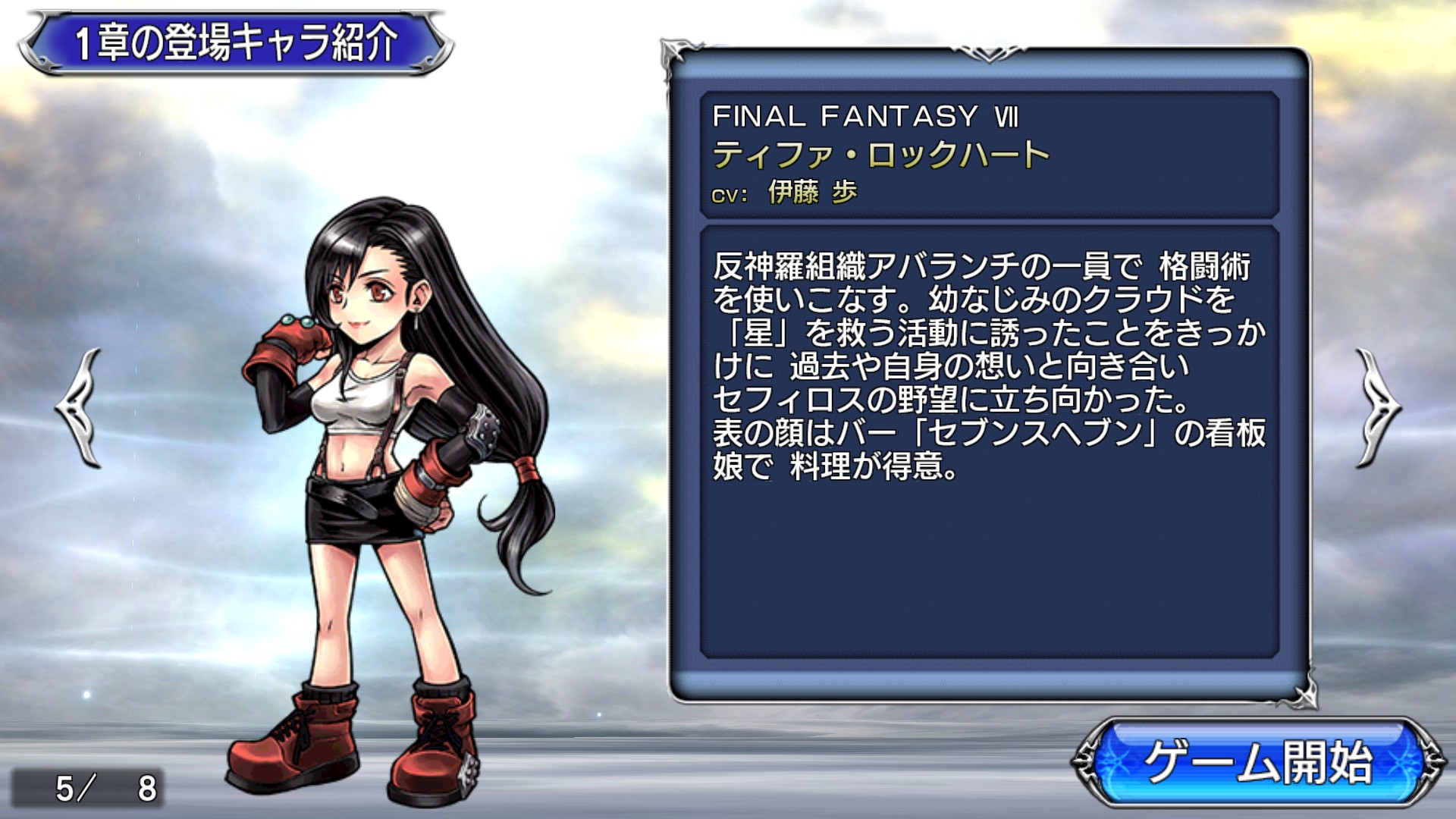 1章に登場するキャラ8人のうちから1人を選べます。FF1の主人公やFF7の主人公はもちろん、FF9のもう一人の主人公とも言われる魔道士ビビやFF13のアフロ枠サッズといったキャラまで出てきているのを見て、FFファンなら間違いなく興奮します。