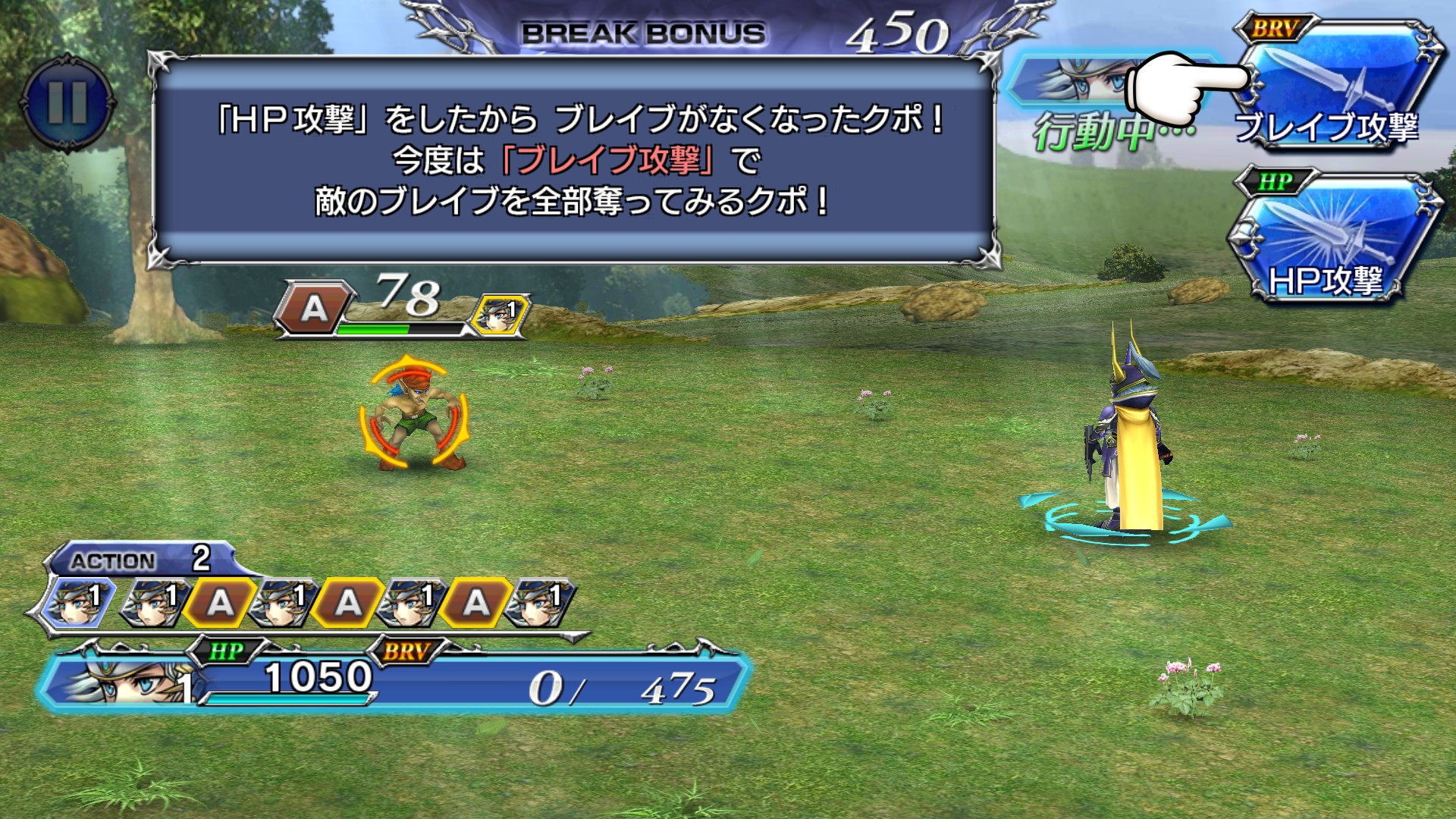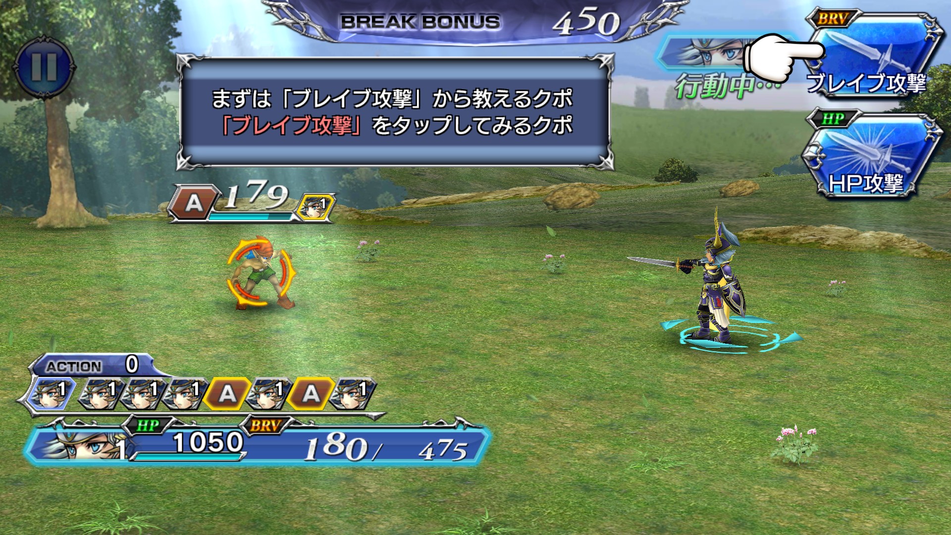 このゲームアプリでもその独特のバトルシステムはちゃんと再現されています。DFFをやったことある人にはこれもおなじみ、ブレイブ攻撃とHP攻撃です。