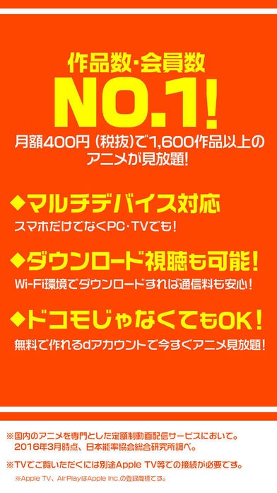 dアニメストアは、ドコモ・アニメストアが運営する、作品数・会員数が国内No.1の月額400円で約2,000作品のアニメが見放題の動画配信サービスです。