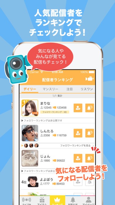 人気でお気に入りの配信者の順位をチェックしたり、新しくお気に入りの配信者を見つけたい方はランキング上位の人の配信を選んで視聴したりと、様々な使い方ができます。