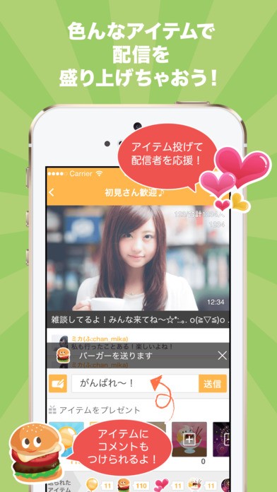 配信の視聴中にコメントやアイテムを送って、配信を盛り上げることができます。また、フォロー機能が付いているので、お気に入りの配信者ができたらフォローをして、頻繁にお気に入りの配信者を盛り上げると、配信者と仲良くなることができます。