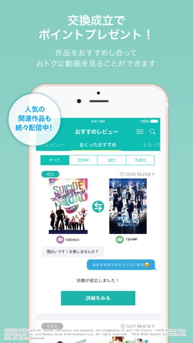 自分が書いた映画のレビューと、他のユーザーが書いたレビューを交換する機能があります。この『レビュー交換』が成立すると、映画を観るために使ったポイントがポイントバックがされる上に、交換したレビューの映画を観ることもできます。