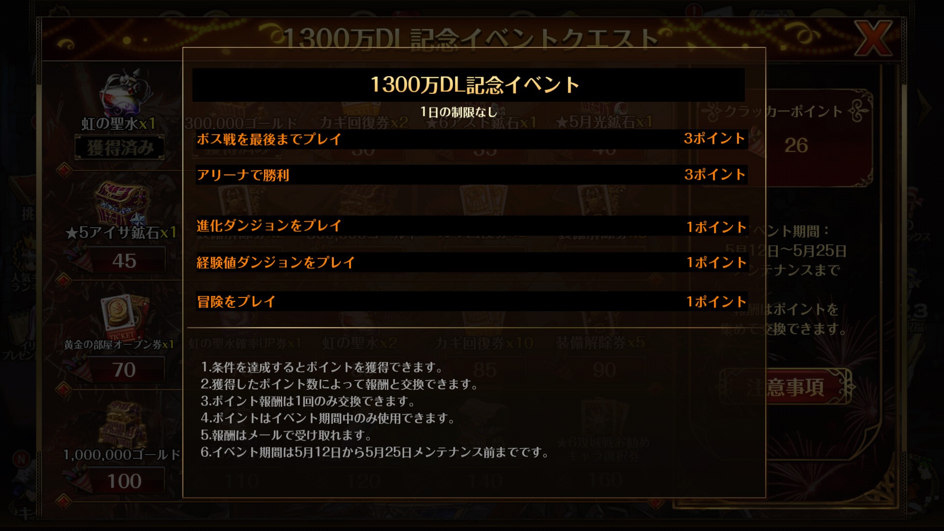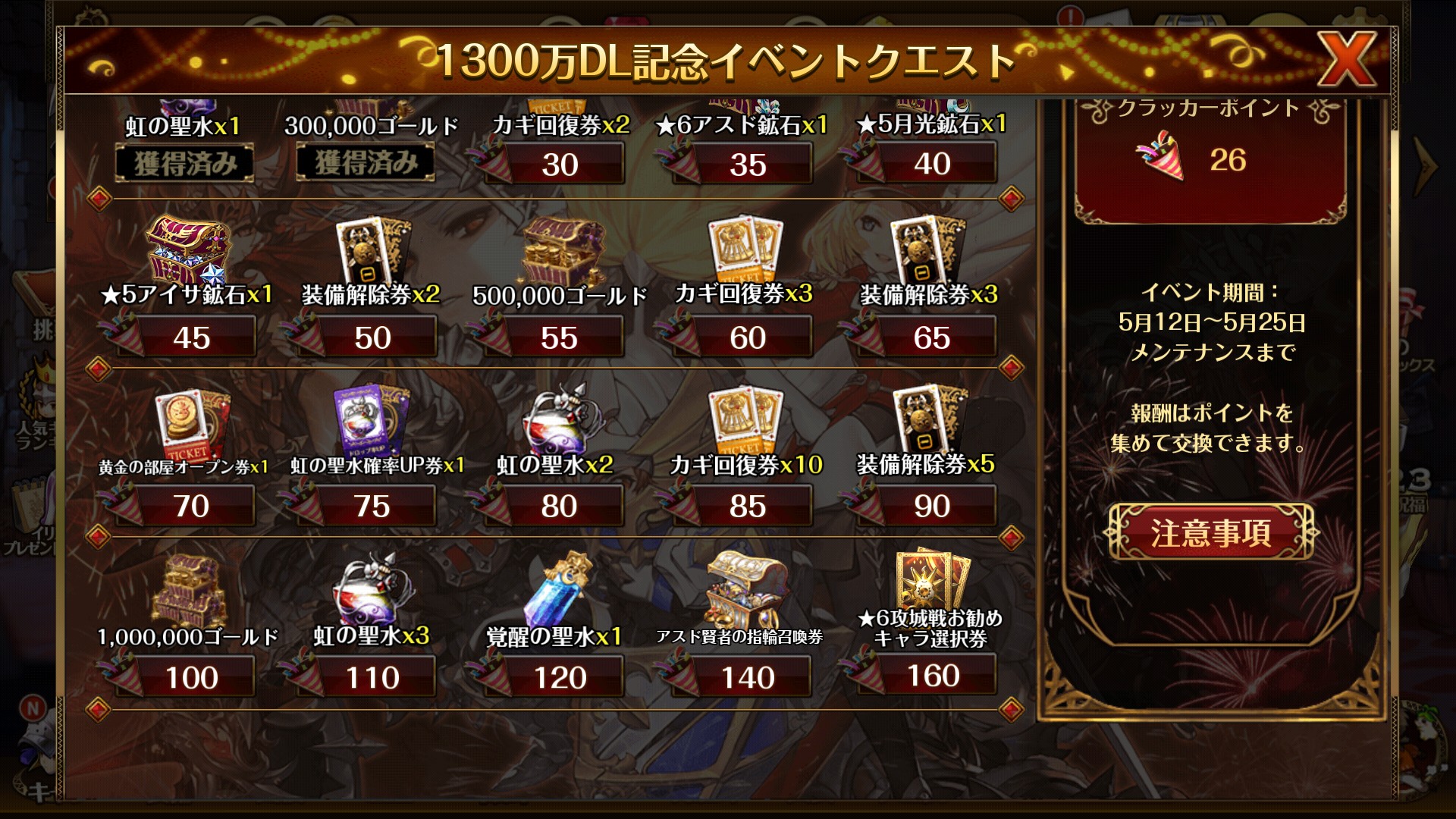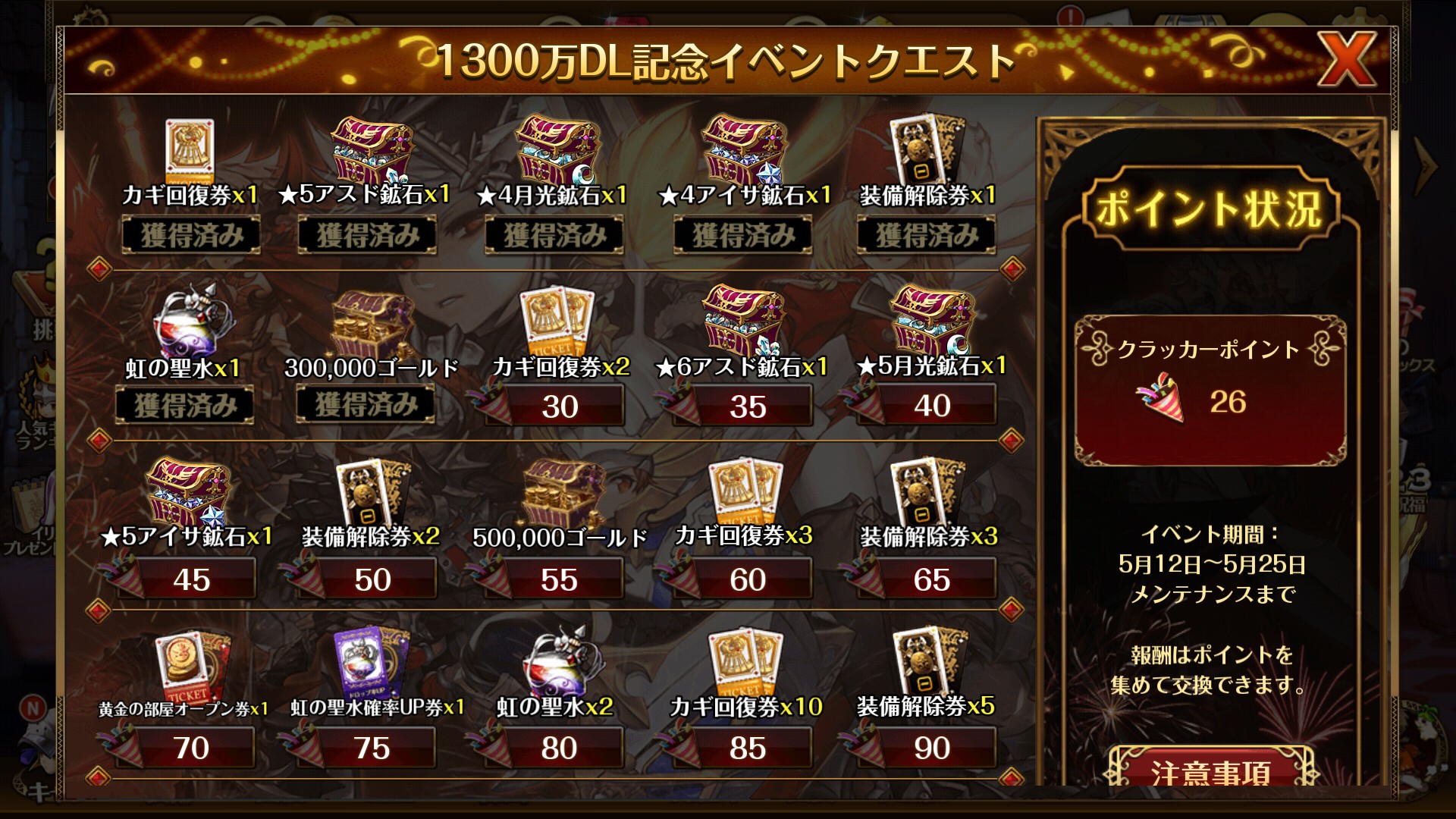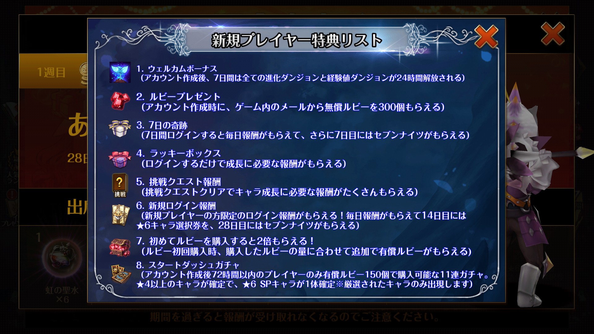8つの特典が用意されています(10連ガチャ(☆6SPキャラ1体確定、ルビープレゼント、挑戦すれば、するほど☆6キャラ選択券などの報酬のもらえる挑戦クエスト等)