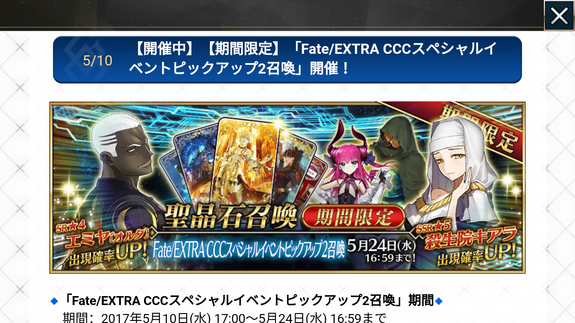 また殺生院キアラのピックアップ召喚より先行して開催されていた「Fate/ExtraCCCスペシャルイベントピックアップ召喚」も引き続き開催されています。
