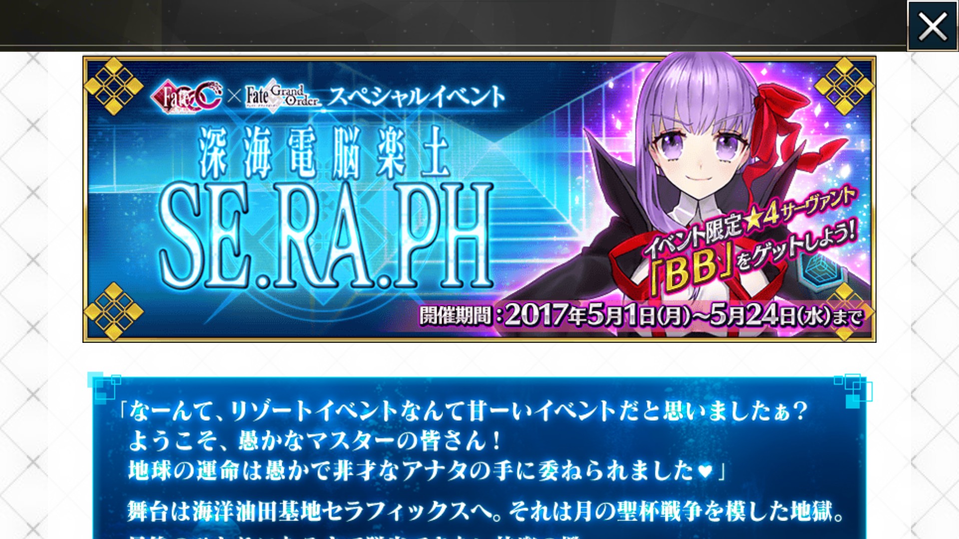 5月24日(水)まで同じくFateシリーズのゲーム「Fate/ExtraCCC」とコラボしたイベント「深海電脳楽士SE.RA.PH」が開催されています。
