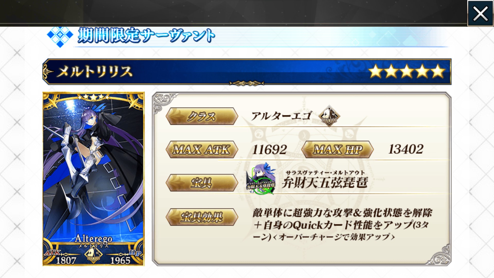 ★5サーヴァントのメルストリス、クラスは新登場の「アルターエゴ」です。宝貝は「弁財天五絃琵琶」になっています。敵単体に高火力の攻撃を与え、バフを解除する宝貝は強敵に挑む時に最適ですね。