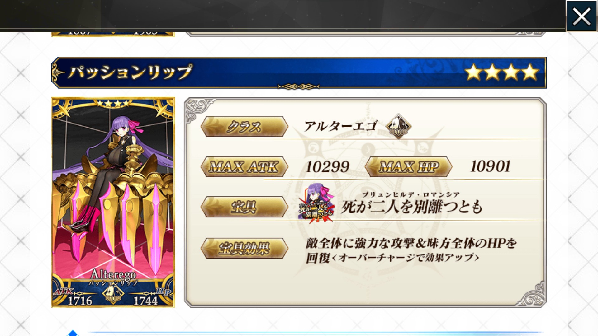 期間限定サーヴァント「メルトリリス」★4サーヴァントのパッションリップもクラスは「アルターエゴ」。宝貝は「死が二人を別離つとも」というロマンティックな名前です。効果は敵に全体攻撃と味方全体HP回復ということで非常に使い勝手が良い宝貝になっています。