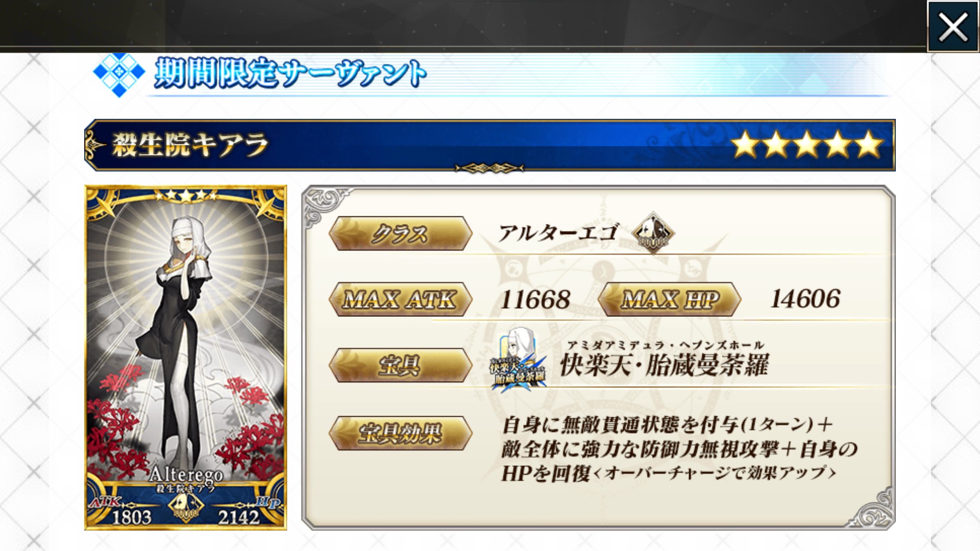 筆者撮影。コラボイベントにも登場する殺生院キアラ。殺生院キアラは強力な宝貝「快楽天・胎蔵曼荼羅」を備えています。自身に無敵バフをかけHP回復をしながら、敵には防御力無視の全体攻撃をぶっ放すという無慈悲なもの。