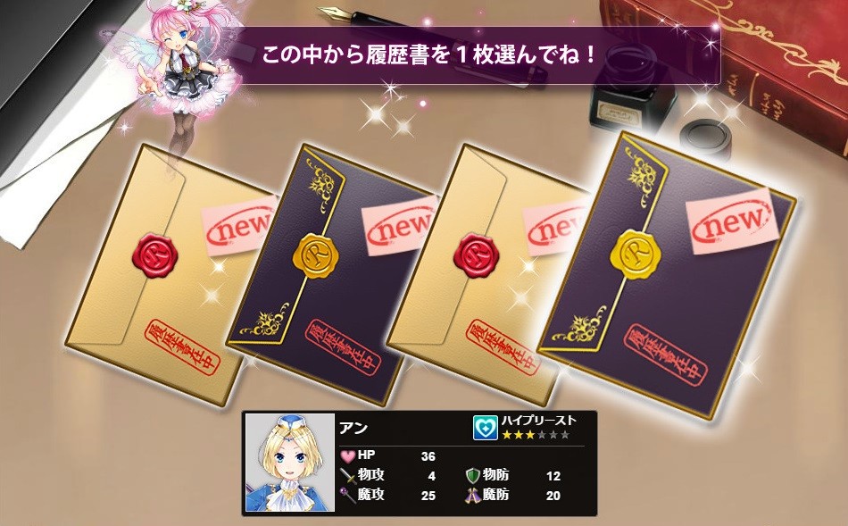 履歴書は封筒に入った状態で届くが黒い封筒に入っているものは★3以上が確定しているため出現したらこれを選択することをおすすめする。