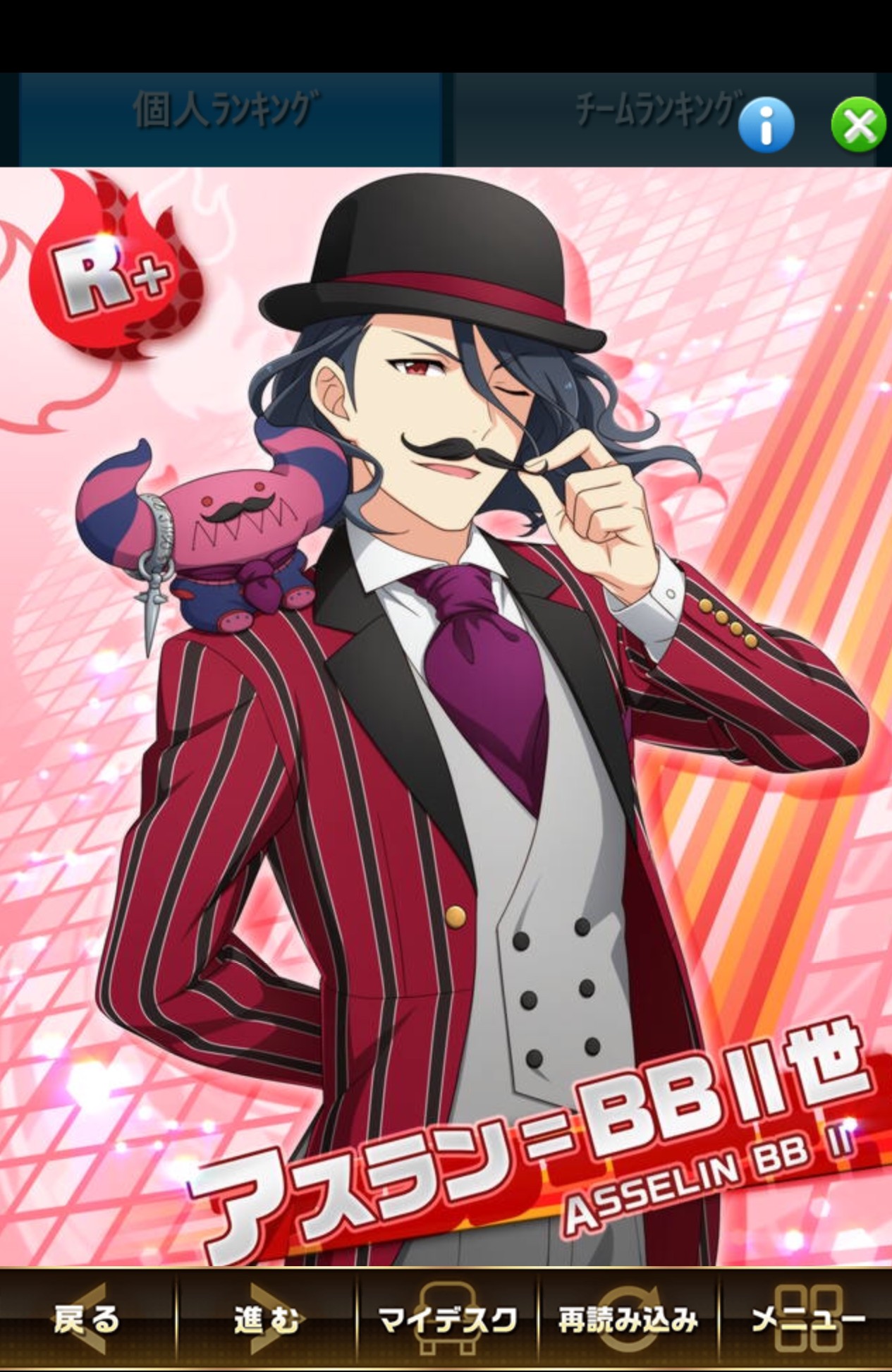筆者撮影。つけ髭と帽子が似合い過ぎなアスラン。この他ランキング報酬としてR「レトロ喫茶」アスラン=BBⅡ世があります。1位から20000位以内に入賞することで確定で入手できます。