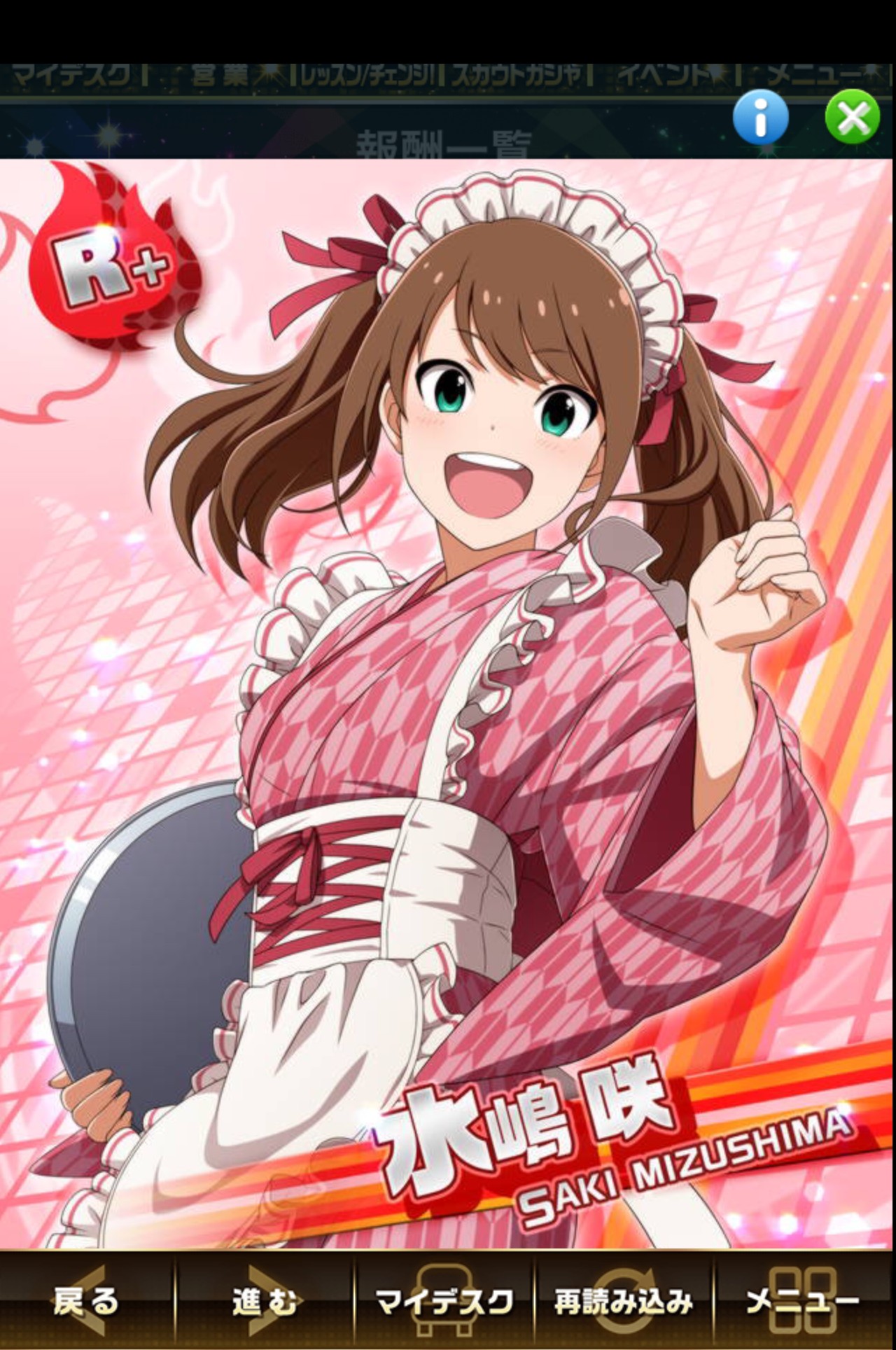 筆者撮影。めいど姿が似合い過ぎな咲ちゃん。またイベント期間中に一定ポイント稼ぐとR「レトロ喫茶」水嶋咲が入手できます。