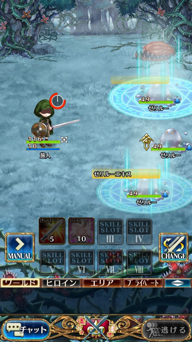 マップを探索して敵と遭遇すると、バトルが開始します。難しい操作はなく、ワンタップで簡単に攻撃とスキルを発動できます。