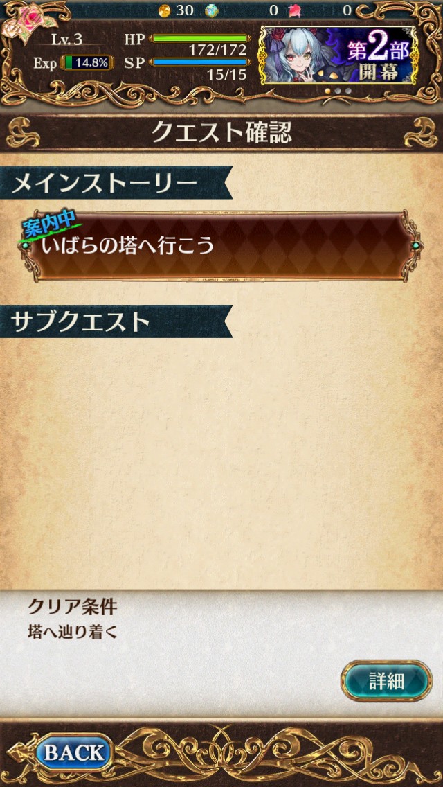 クエストは、物語を進めていく『メインクエスト』と、サブクエストの『協会クエスト』があります。クエストをクリアすると、ローズリーフやアイテムをもらえます。