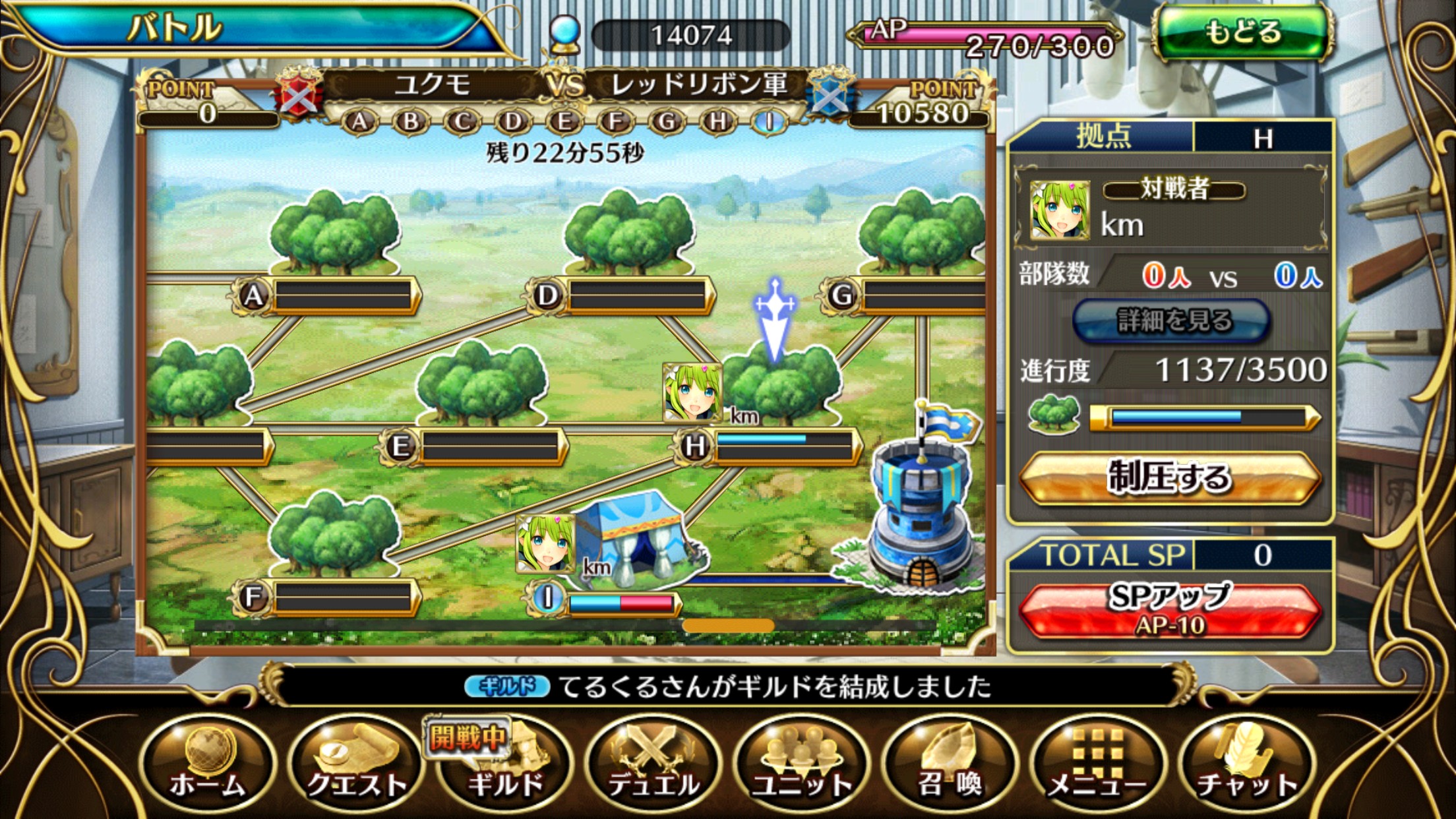 ギルド戦は9個ある拠点をお互い制圧していき、制限時間(30分)内に多くの拠点を制圧したギルドが勝ちになります。