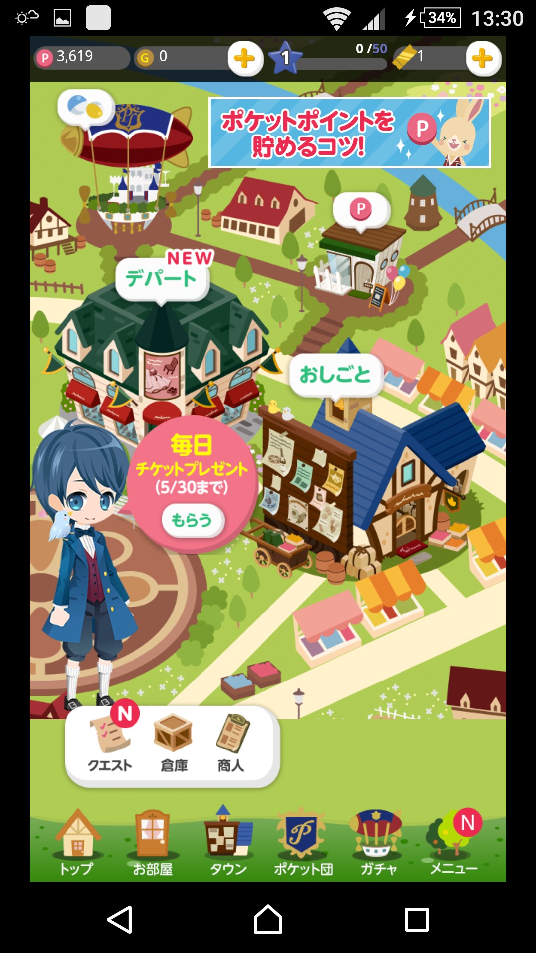 着せ替えるアイテムは、ゲームのなかにあるポケットランドで「おしごと」をすることで稼げるポイントを使って、デパートで「お買いもの」をしてゲットします。